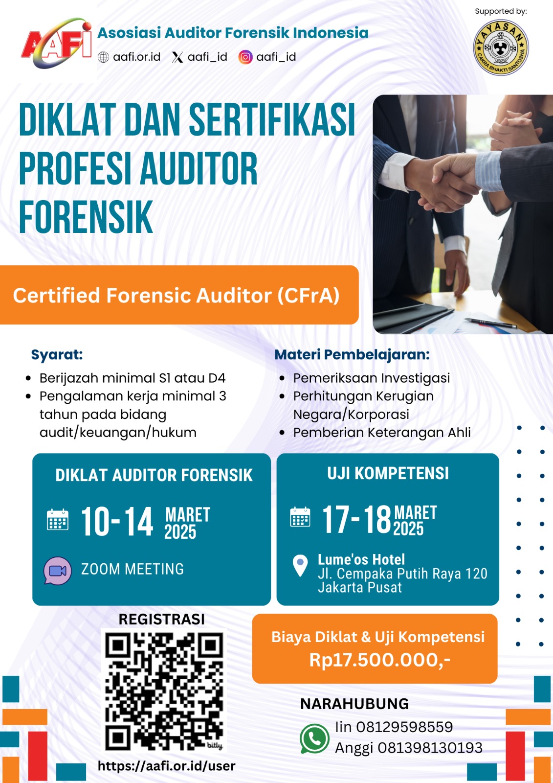 Asosiasi Auditor Forensik Indonesia Tenabaga (AAFI TENABAGA), dengan dukungan dari Yayasan Cakra Bhakti Santosha, kembali mengadakan Diklat dan Sertifikasi Profesi Auditor Forensik dengan gelar Certified Forensic Auditor (CFrA). Program ini bertujuan untuk meningkatkan kompetensi para auditor dalam bidang audit investigatif dan forensik guna mendukung upaya pemberantasan tindak pidana keuangan dan korupsi.